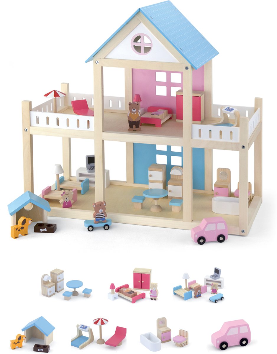 houten poppenhuis Happy Villa inclusief meubels 28-delig.