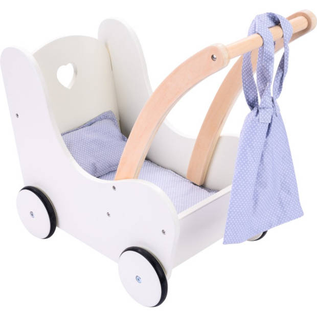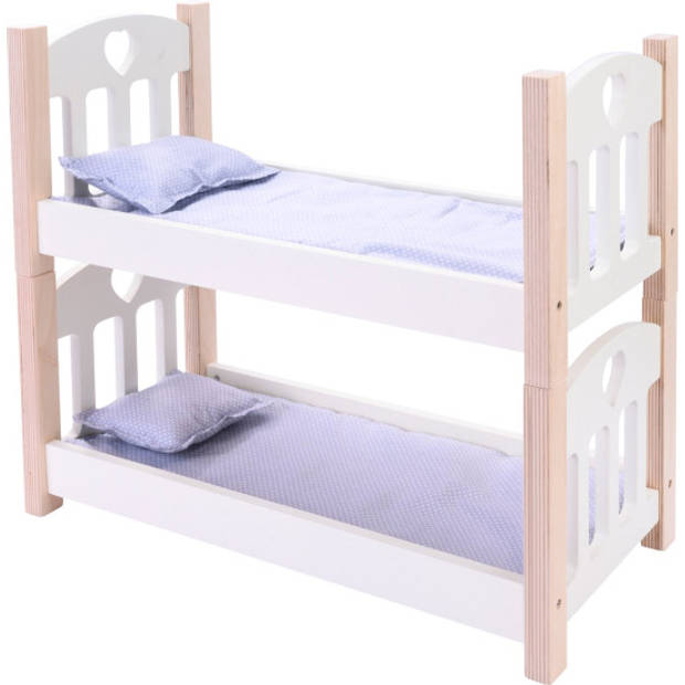 Dubbel pret! Hout poppenbedje in de kleur wit met uitgestanst hart. Bovenste bedje is afgewerkt met roze knoppen. Bedjes zijn ook los te gebruiken. Inclusief lakenset. In luxe gekleurde doos. Afmetingen 50,5 x 27,5 x 43cm.