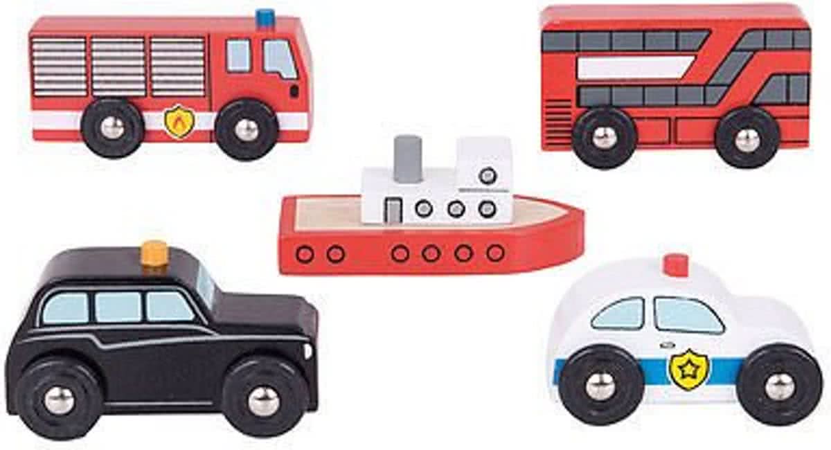 Tijd voor wat extra verkeer in je treinbaan. Deze autoset bestaat uit een zwarte taxi rode dubbeldekker brandweerwagen politieauto en een stoere boot.