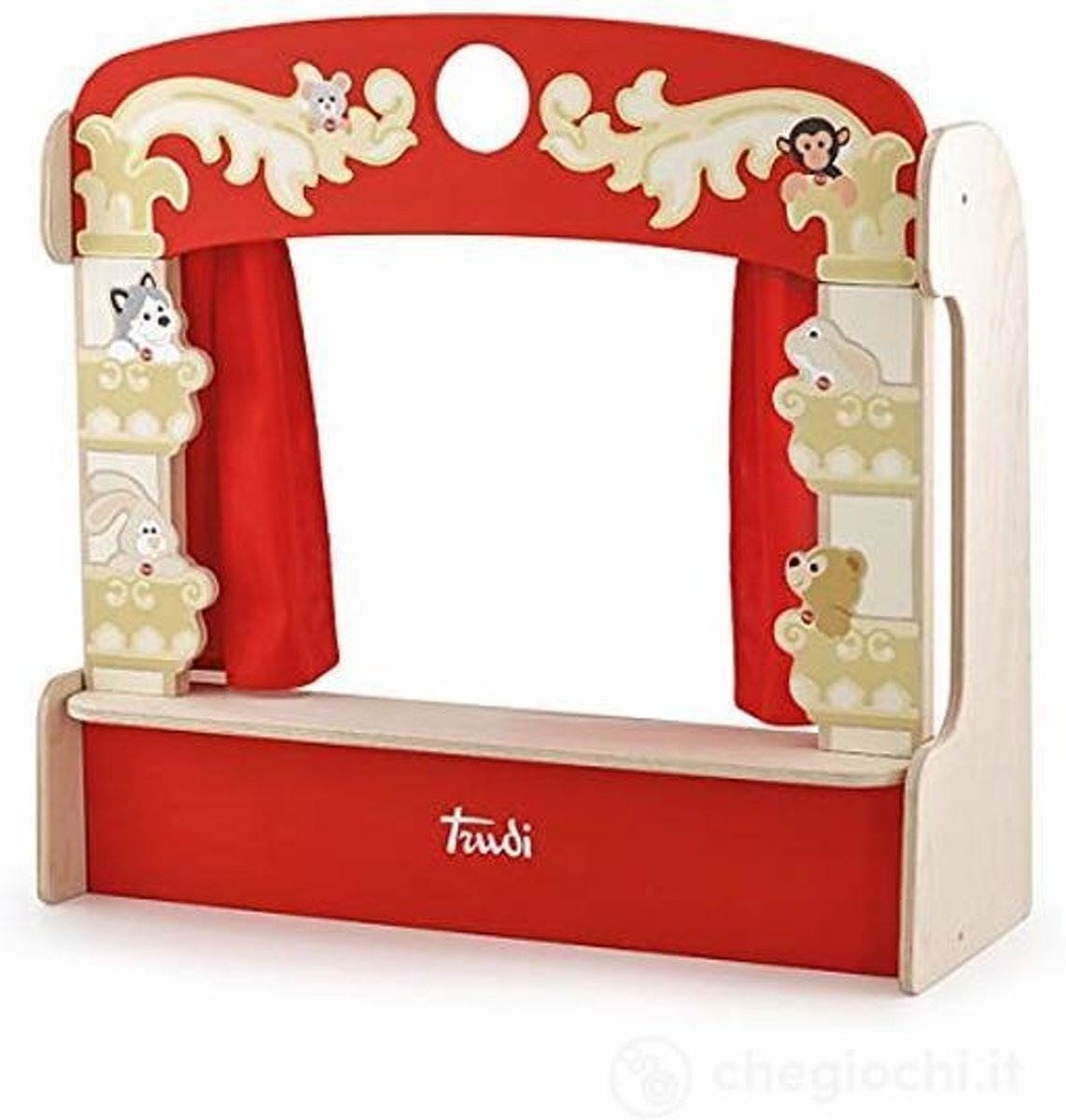 Houten poppenkast in rode kleur waarmee je kinderen de leukste of spannendste verhalen kunnen naspelen. Helpt om de motoriek en taalvaardigheid te verbeteren. Kinderen kunnen samen met vrienden een show opvoeren, wat de sociale vaardigheden verbetert. Afmetingen: 87,5 x 55 x 24,5 cm (LxBxH).