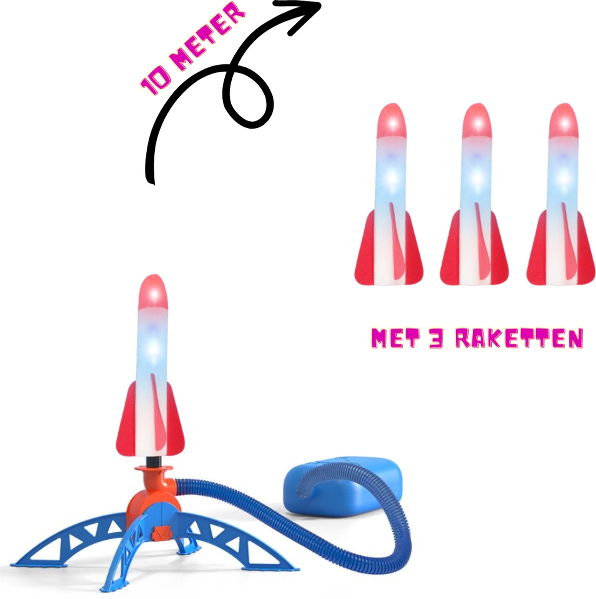 Speelgoed Raket met Licht - Inclusief 3 rakketten - Buitenspeelgoed met pomp-traptechnologie - Vlieg tot wel 10 meter de lucht in - Perfect voor kinderfeestjes en buitenspelen