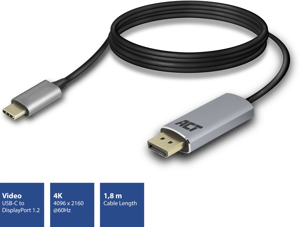 USB-C naar DisplayPort male aansluitkabel, 4K @ 60Hz, kabellengte 1,8m, aluminium behuizing AC7035