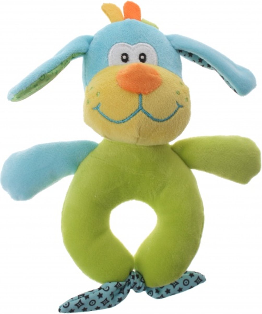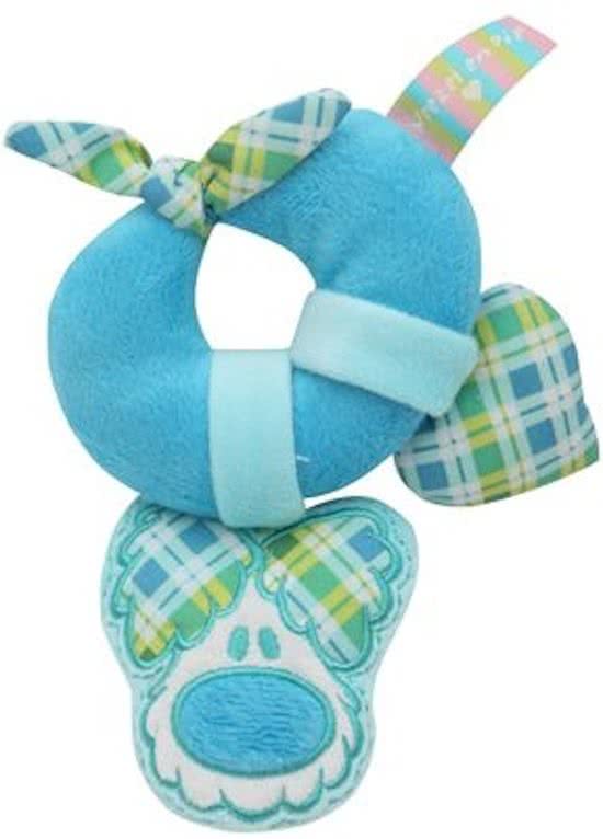 | Inhoud | Eddy Toys pluche rammelaar hond blauw/groen 16 cm |