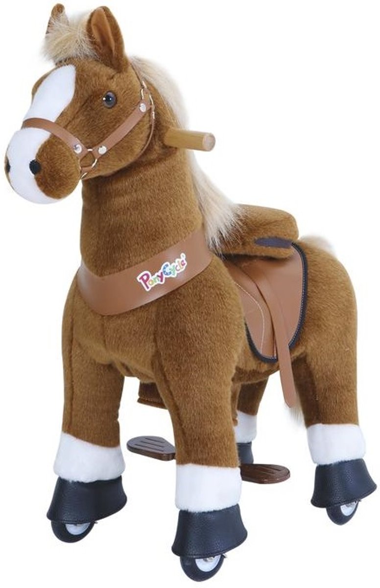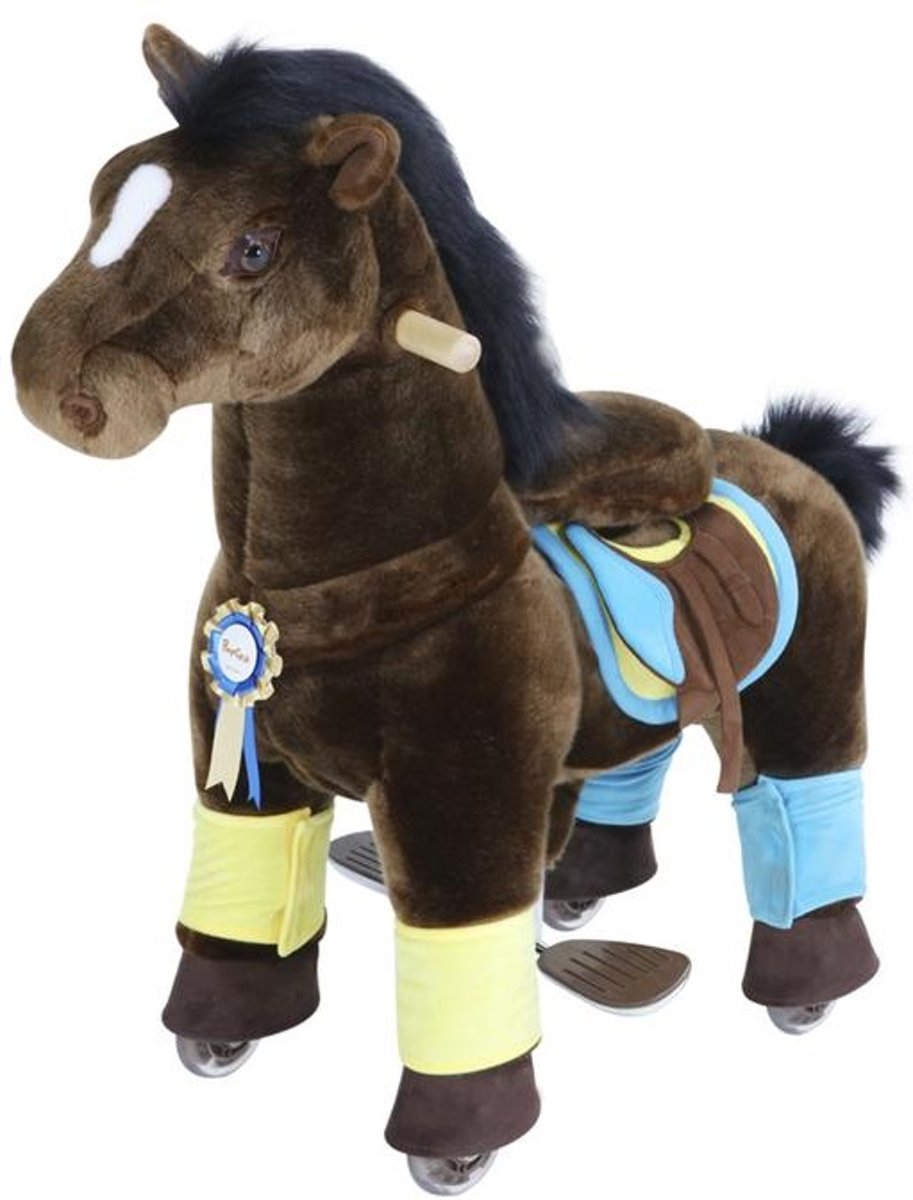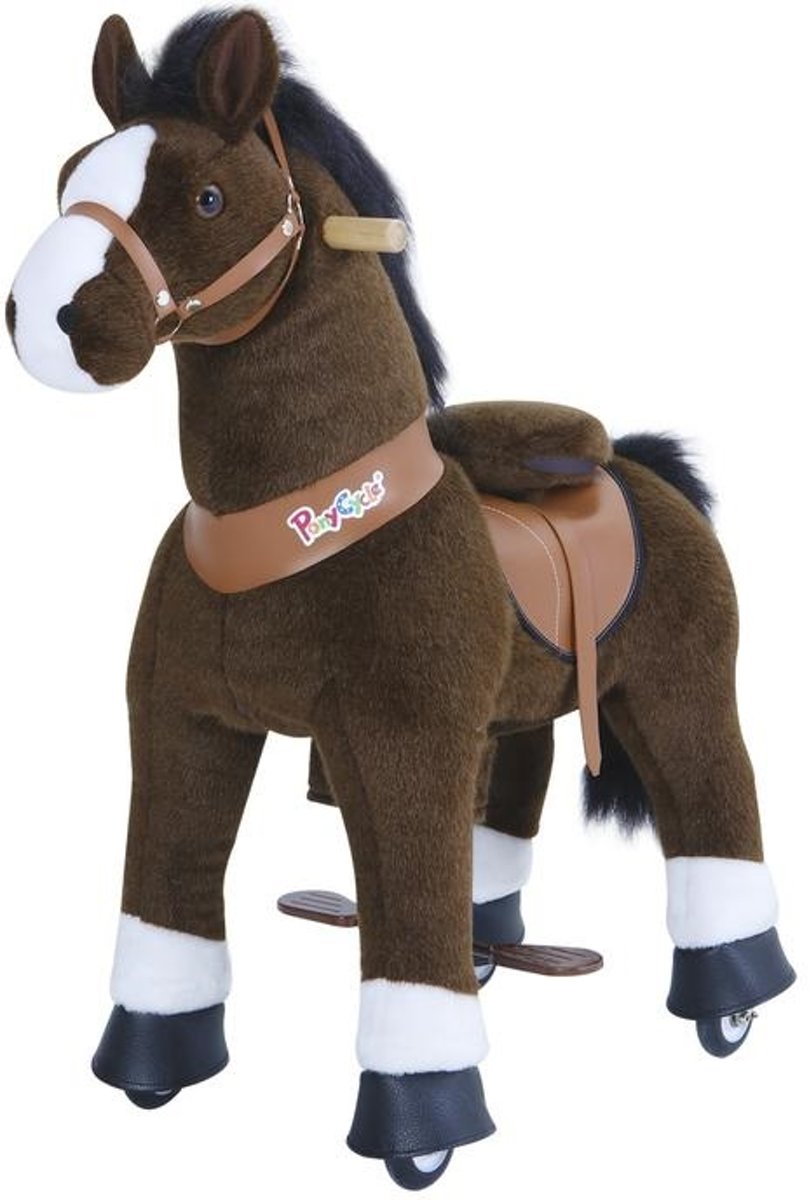 PonyRide Rijdend Speelgoed Paard - Hobbelpaard - 74x29x79 cm - 3-6 Jaar - Inclusief Inline Skate Wieltjes en leder zitje - Bruin