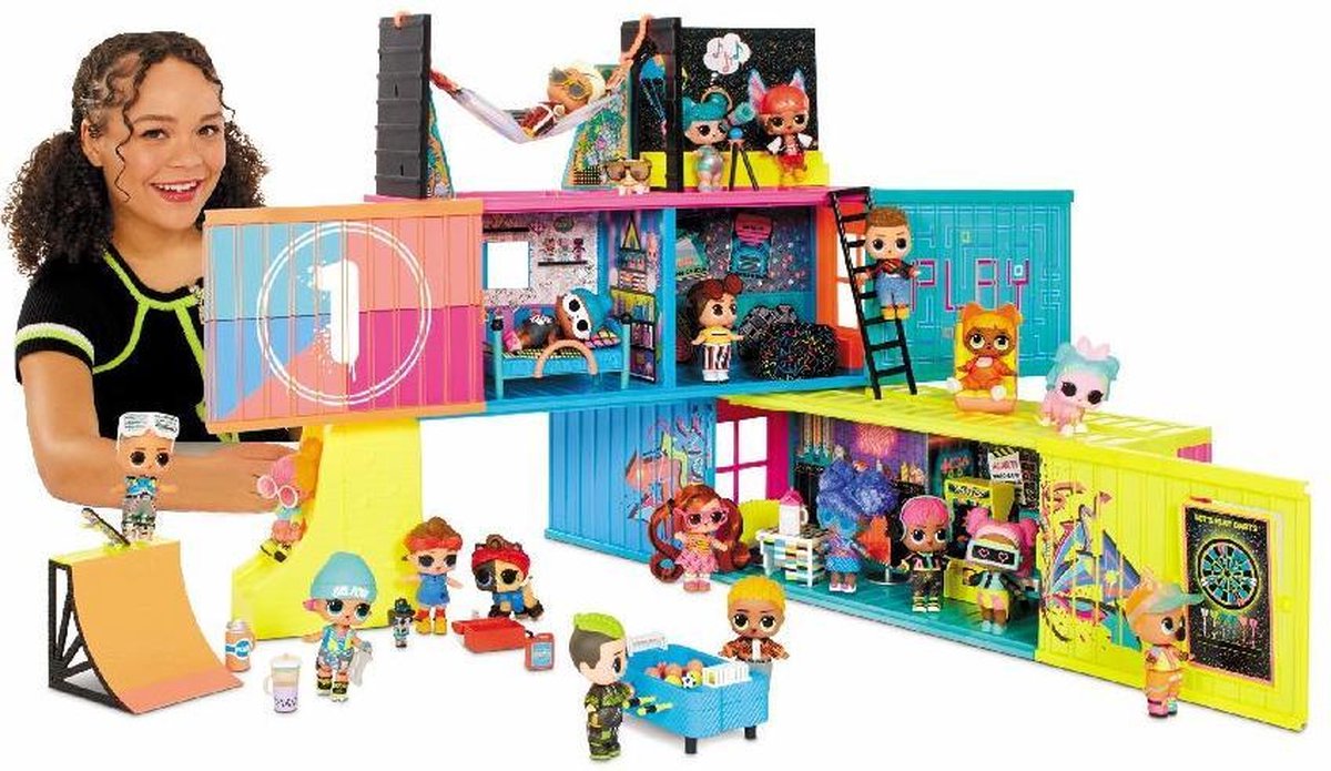 Pak 40 verrassingen uit met de ultieme relaxplek voor L.O.L. Surprise!-poppen en jongenspoppen: het L.O.L. Surprise! Clubhuis. De speelset ziet eruit als twee stijlvolle scheepscontainers, maar kan uitgeklapt worden tot een volledig ingericht clubhuis van 3 verdiepingen. In het clubhuis vind je meer dan 7 chillgebieden met o.a. een gameroom, een skateboardzone, terras, bioscoopruimte, slaapkamer en keuken! Pak meubels en accessoires uit voor het hele huis, zoals een tafelvoetbaltafel, zitzak, hangmat en meer.
