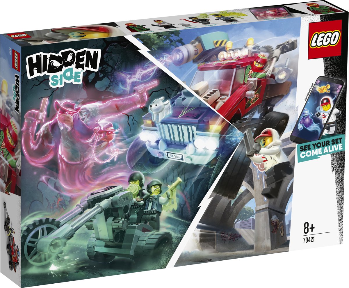Ben jij klaar voor de verborgen kant? Sluit je aan bij held Jack Davids en zijn dappere stuntmaatje, El Fuego, om de 2 spookmotorrijders Joey en Dwayne te vangen en te verslaan! Download de LEGO® Hidden Side™ app en richt je telefoon op El Fuego`s stunttruck om deze tot leven te laten komen.