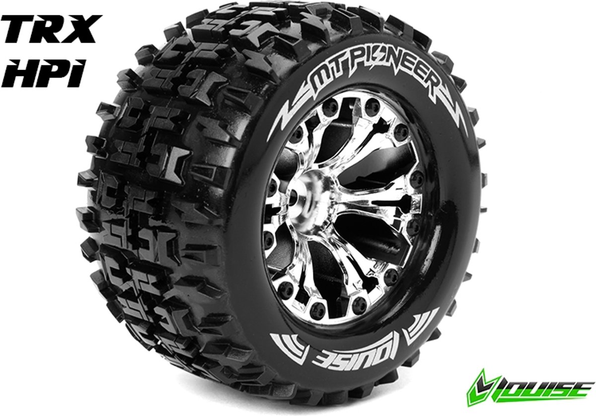 "Louise RC - MT-PIONEER - 1-10 Monster Truck Banden Set - Verlijmd op velg - Soft - 2.8"" Velgen Chroom - 1/2""-Offset - GP JATO 2WD Achter - GP STAMPEDE 2WD Achter - GP RUSTLER 2WD Achter - EP STAM"