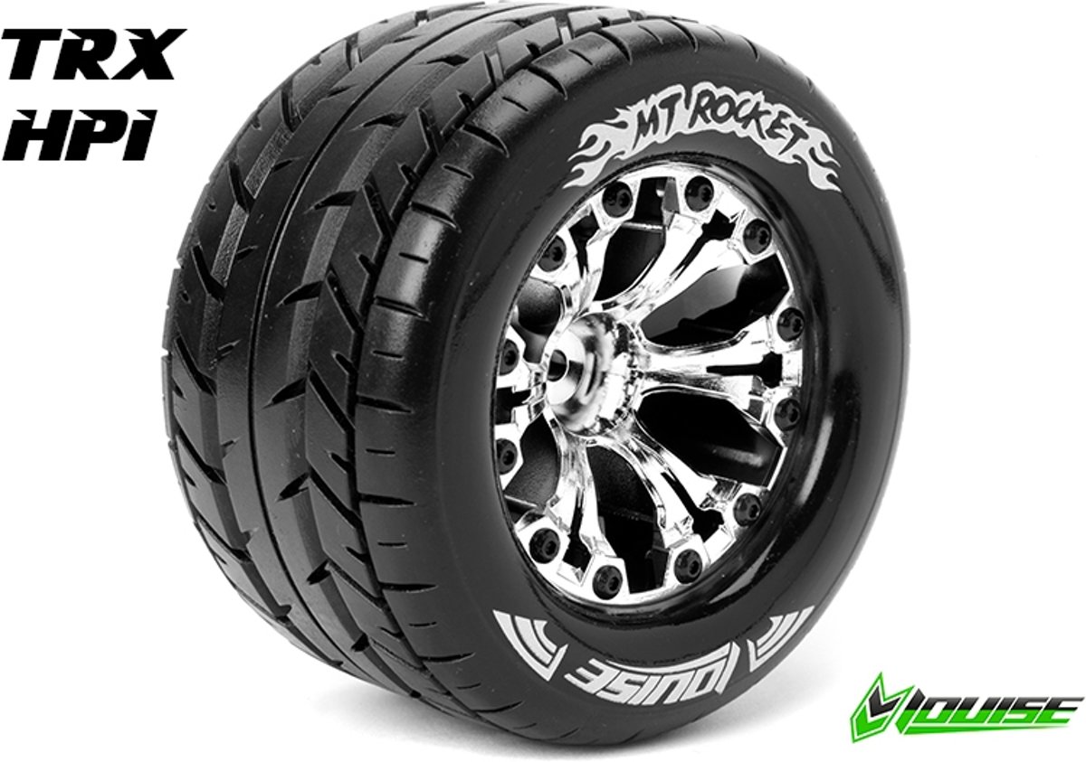 "Louise RC - MT-ROCKET - 1-10 Monster Truck Banden Set - Verlijmd op velg - Soft - 2.8"" Velgen Chroom - 1/2""-Offset - GP JATO 2WD Achter - GP STAMPEDE 2WD Achter - GP RUSTLER 2WD Achter - EP STAMP"