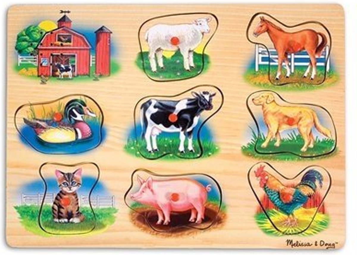 Knopjespuzzel van het merk Melissa & Doug in een boerderijthema. De puzzel maakt geluid wanneer je de stukjes goed geplaatst hebt.
