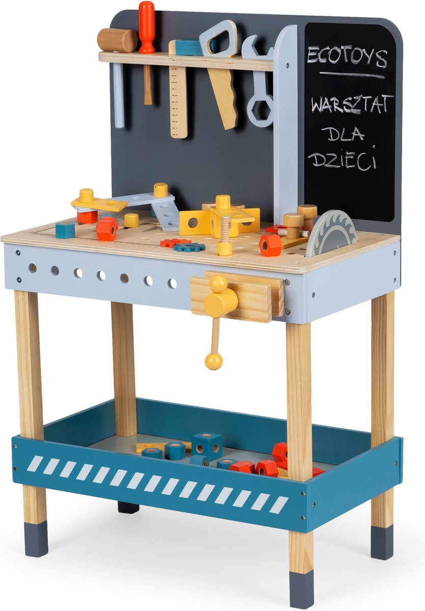 • Bevat een hamer, schroevendraaier, tang, meetlat en een geverfde zaag samen met acht bouwstukken.