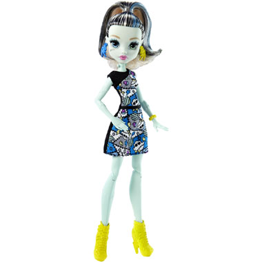 Met Frankie Stein van deze Monster High wordt het nooit meer saai! Deze stoere pop is gekleed in een blauwe jurk en draagt gele schoentjes.