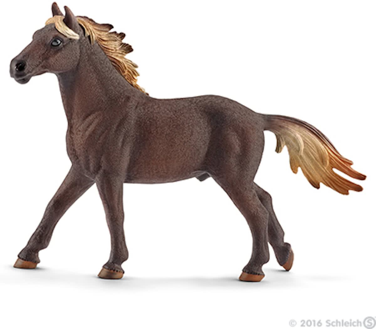 Mustang hengst van Schleich. Mustang hengsten zijn erg dapper. Ze verdedigen hun kudde zelfs als ze gewond zijn. Mustangs worden ook wel mestengos. Dit Spaanse woord betekend ook wel wild, verdwaalde. Mustangs zijn huispaarden, die de Spanjaarden in de 16e eeuw met de boot naar Amerika brachten en vrij lieten . Omdat ze op de vruchtbare weiden veel voedsel vonden en ze bijna geen natuurlijke vijanden hadden, behalve de poema, nam hun aantal snel toe. Tot op heden zijn er nog steeds wilde mustangs die op het land leven. Ze worden geleid door een moedige hengst die zijn kudde beschermt en is meestal de vader van alle veulens.