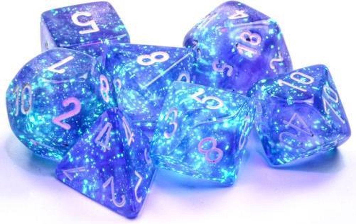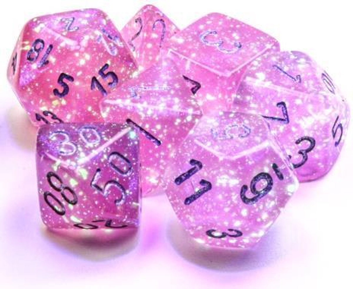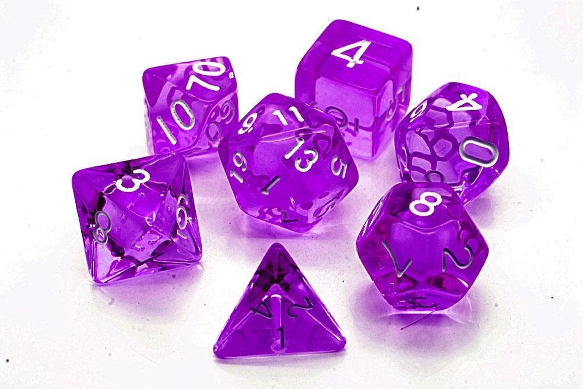 Polydice - Polyhedral dobbelstenen set 8 delig | set van 7 in velours bewaarzakje / pouch / bag | dungeons and dragons | D&D Pathfinder RPG | Paars doorzichtig