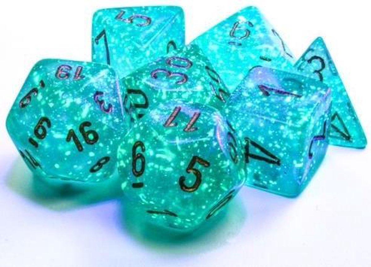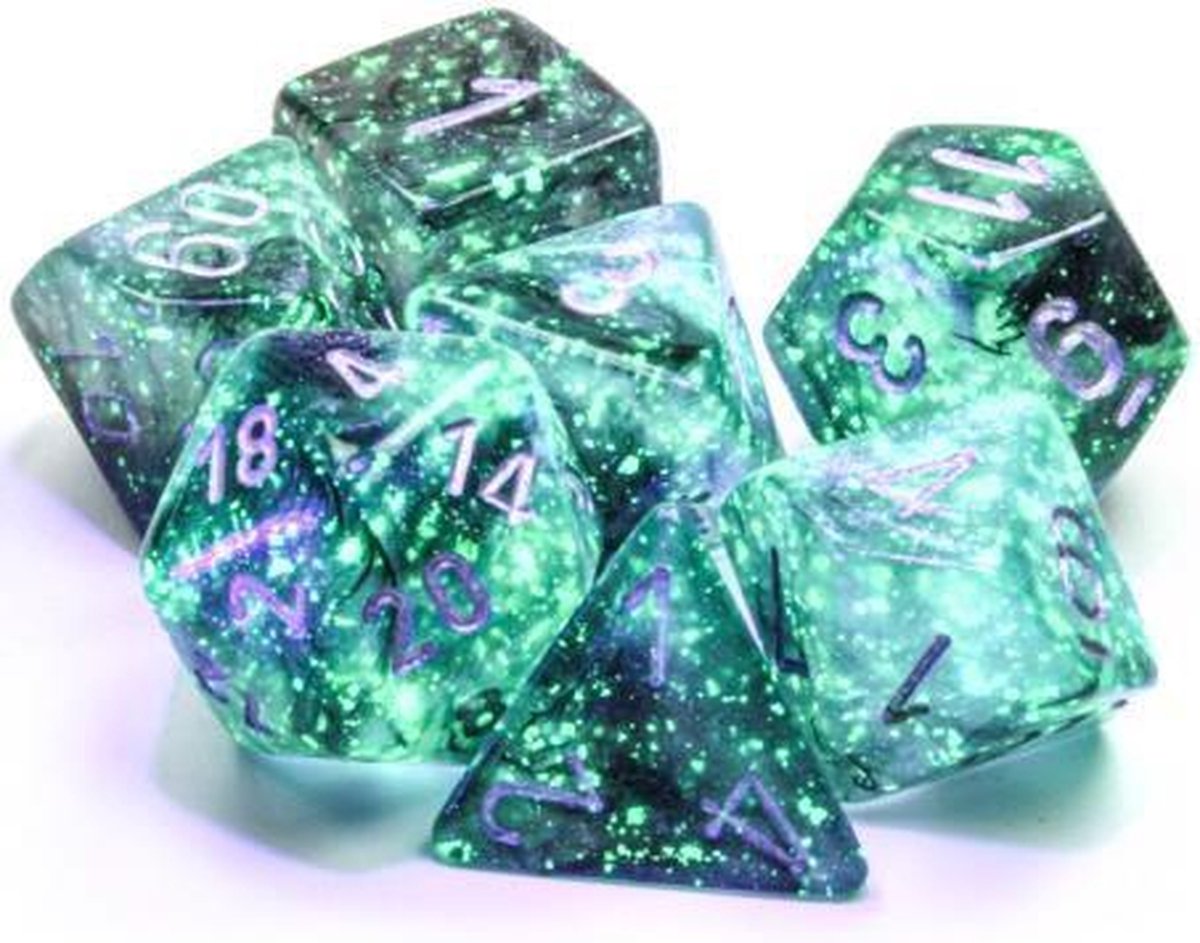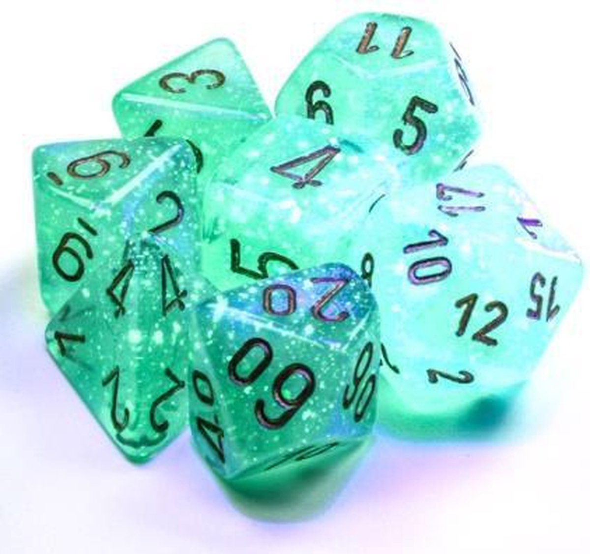 Polydice - Polyhedral dobbelstenen set 8 delig | set van 7 in velours bewaarzakje / pouch / bag | dungeons and dragons | D&D Pathfinder RPG | Paars doorzichtig