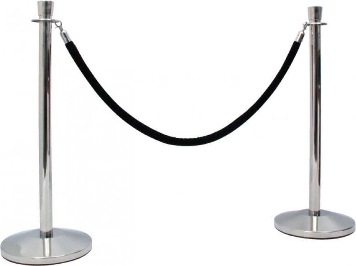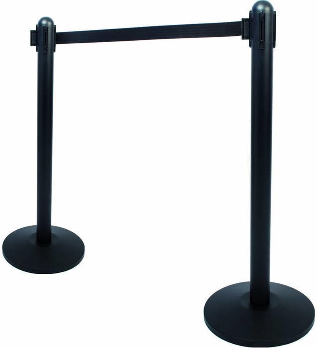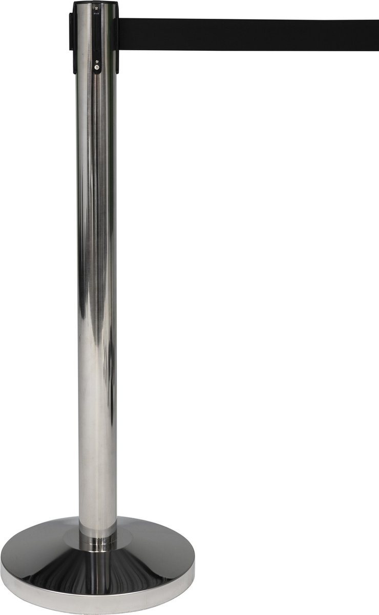 Afzetpaal in verchroomd RVS met zwarte nylon riem van 230 cm. Afzetpalen van hoge kwaliteit.