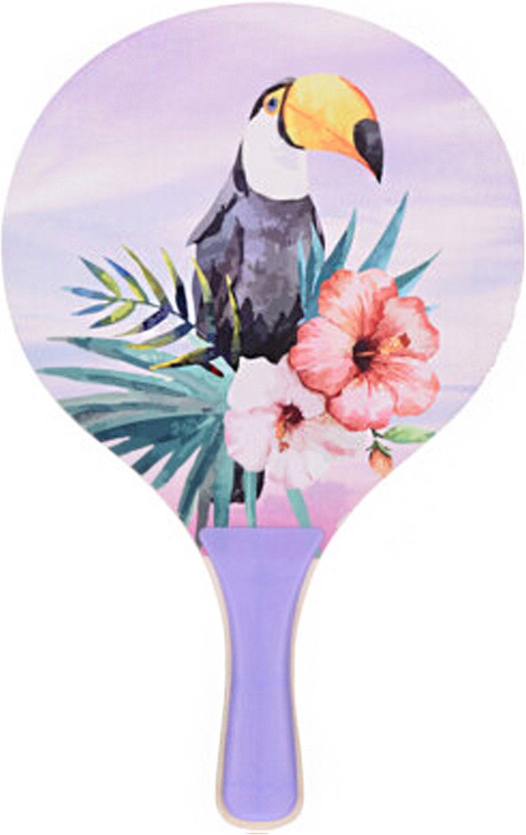 Strandsporten beachball set met tropische print oranje handvat 41 cm. Complete strandbal speelset, bestaande uit 2 rackets/batjes en een balletje.Materiaal: hout (MDF), kunststof, rubber. Actief speelgoed tennissen ballenspel voor jongens/meisjes/kinderen en volwassenen. Beachbalset voor op vakantie/camping/strand of in de tuin.