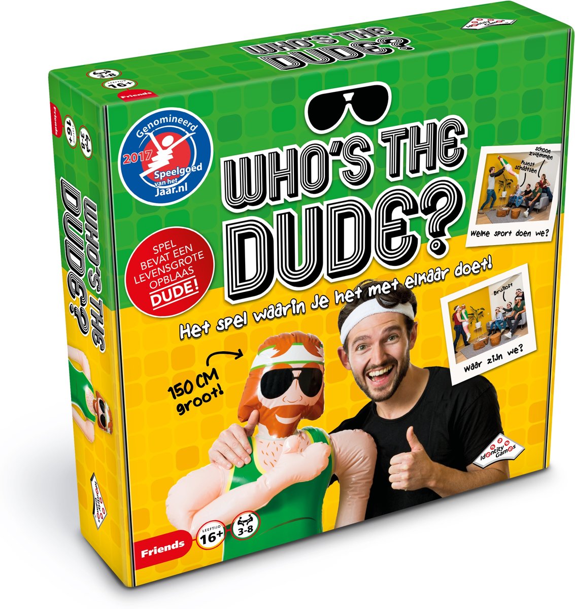 In dit hilarische spel is de levensgrote (150 cm!) opblaasbare Dude je beste vriend. Beeld samen met hem zo veel mogelijk situaties uit. Speel bijvoorbeeld een scène uit een film na of beeld een sport of beroep uit. De andere spelers proberen binnen de tijd te raden wat jij allemaal met de Dude uitbeeldt. Dan is de volgende speler aan de beurt. De speler die na 4 rondes de meeste punten heeft, wint het spel!