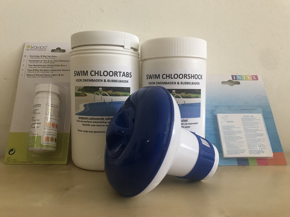 Zwembad Onderhoudsset - Startersset bevat Chloor - Testrips - Chloordrijver en Filter - Onderhoud Starterspakket- voor Opzetzwembaden - Voor middelgrote zwembaden van 2500 tot 25.000 liter (4-delig)