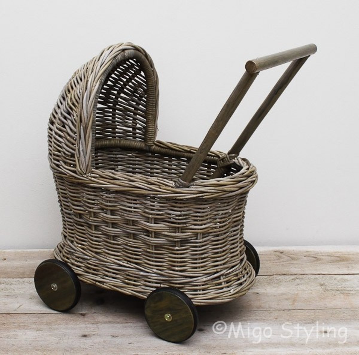The Wicker Stories – Rieten poppenwagen en speelgoedkar – in pastelgrijze kleur met pastelroze stoffen voering aan de binnenkant, handgemaakt in Europa.