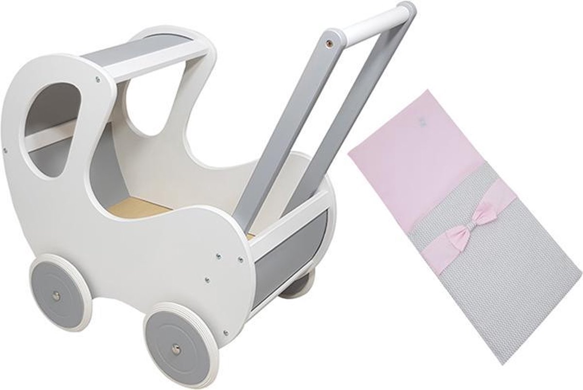 XEO poppenwagenset, met tas, kinderstoel, slaapzak, speelboog, poppenaccessoires, in roze/grijs