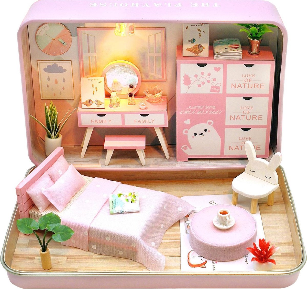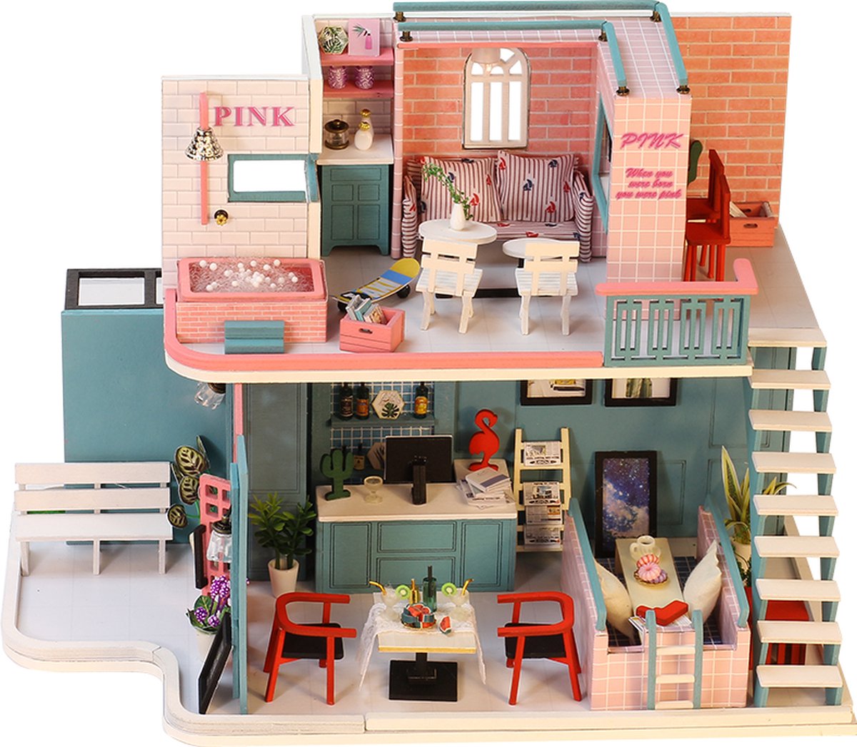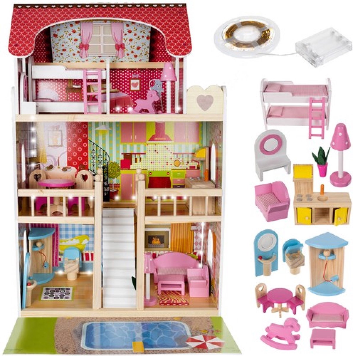 Houten met Meubels en LED Verlichting - Dollhouse van Hout - Kinderspeelgoed voor Jongens en Meisjes - 79 Onderdelen en Accessoires - 70 cm - Roze
