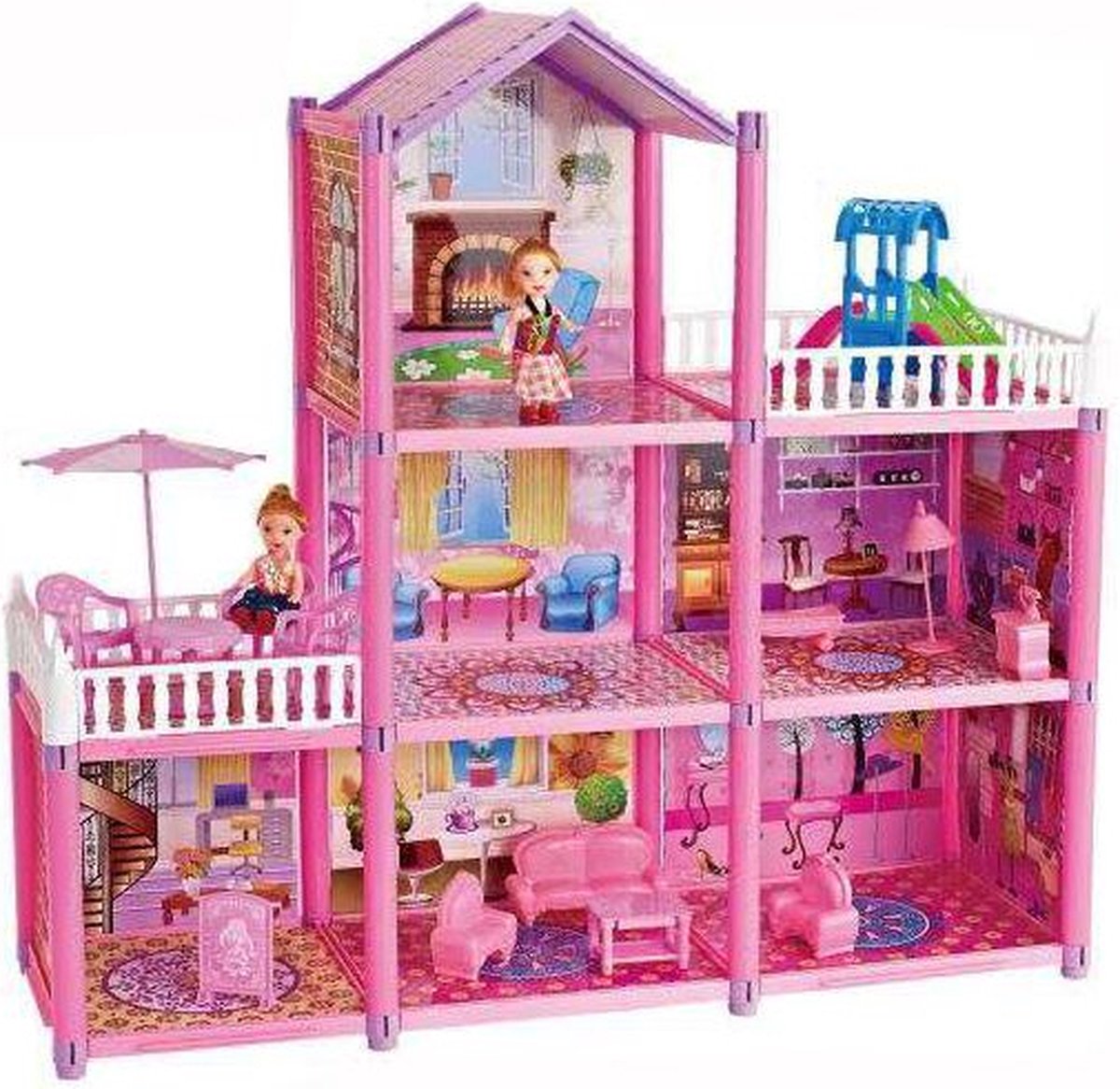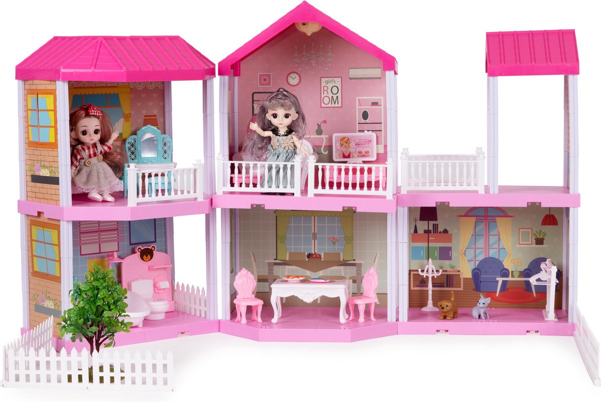 Kinderpoppenhuis Houten Huis 70x60x24cm Set Roze 3 Verdiepingen Playmobil met Meubels & Accessoires Poppenvilla DIY Mobiel Huis Droomvilla, voor Meisjes en Jongens (Type A)