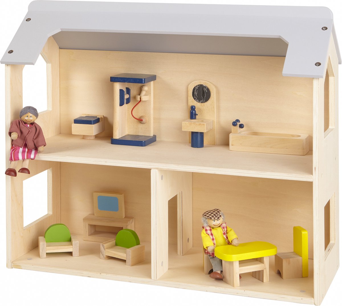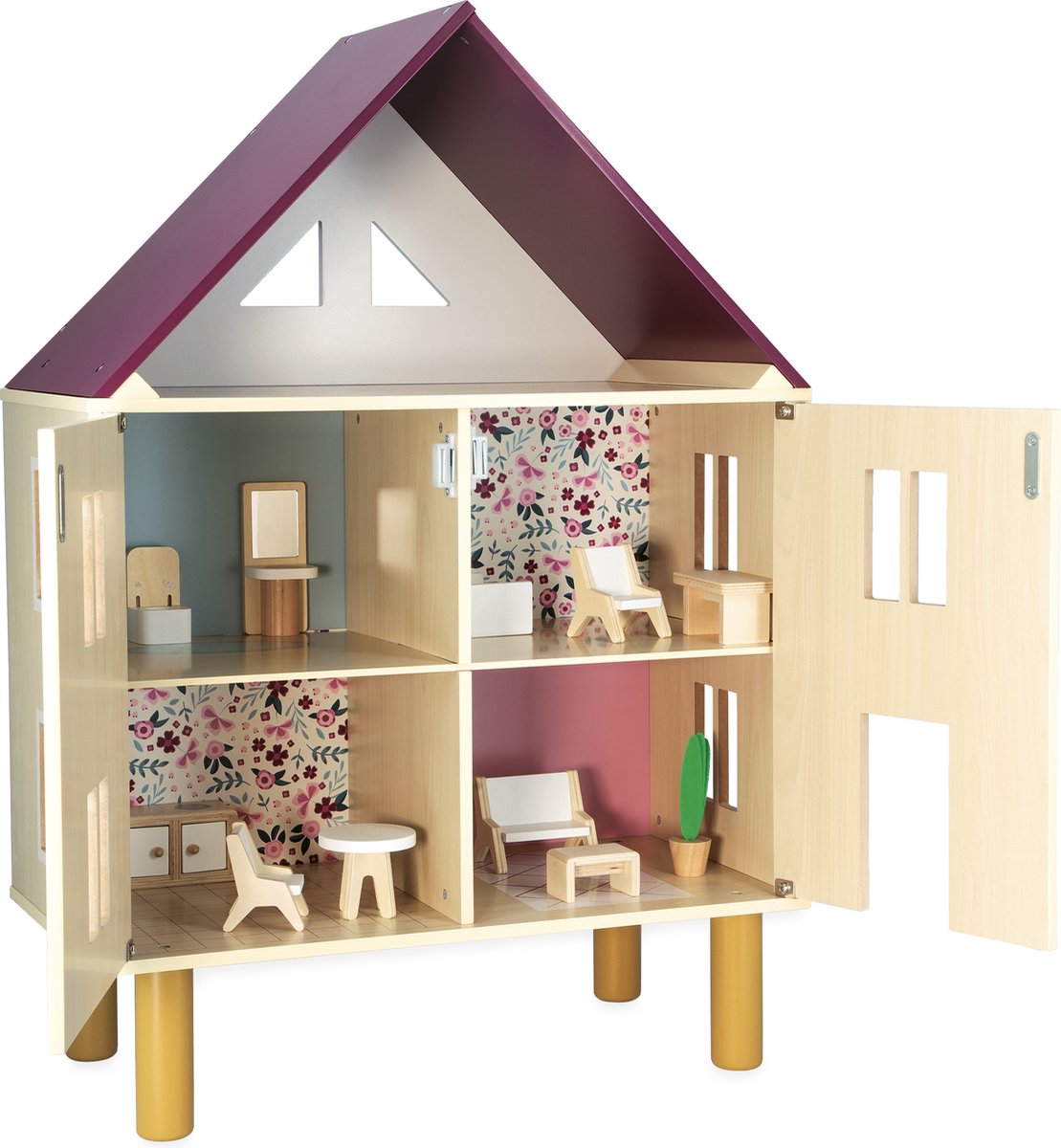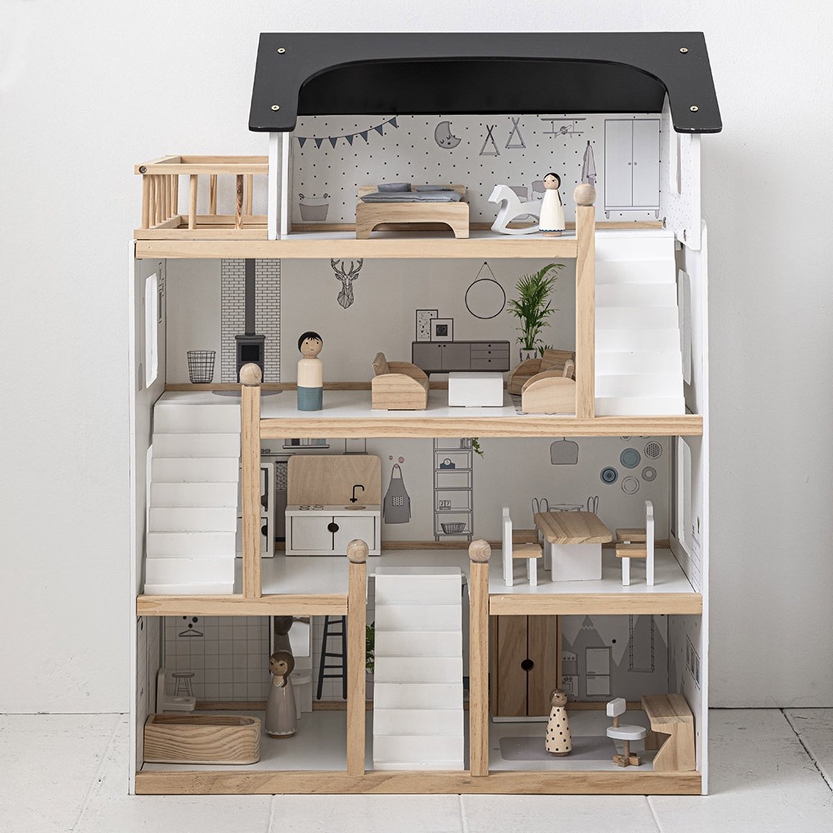[B] Tender Leaf uniek houten poppenhuis Dovetail XL in neutrale kleuren inclusief houten poppen familie plus woonkamer houten meubeltjes 8 stuks - 68 x 70 cm