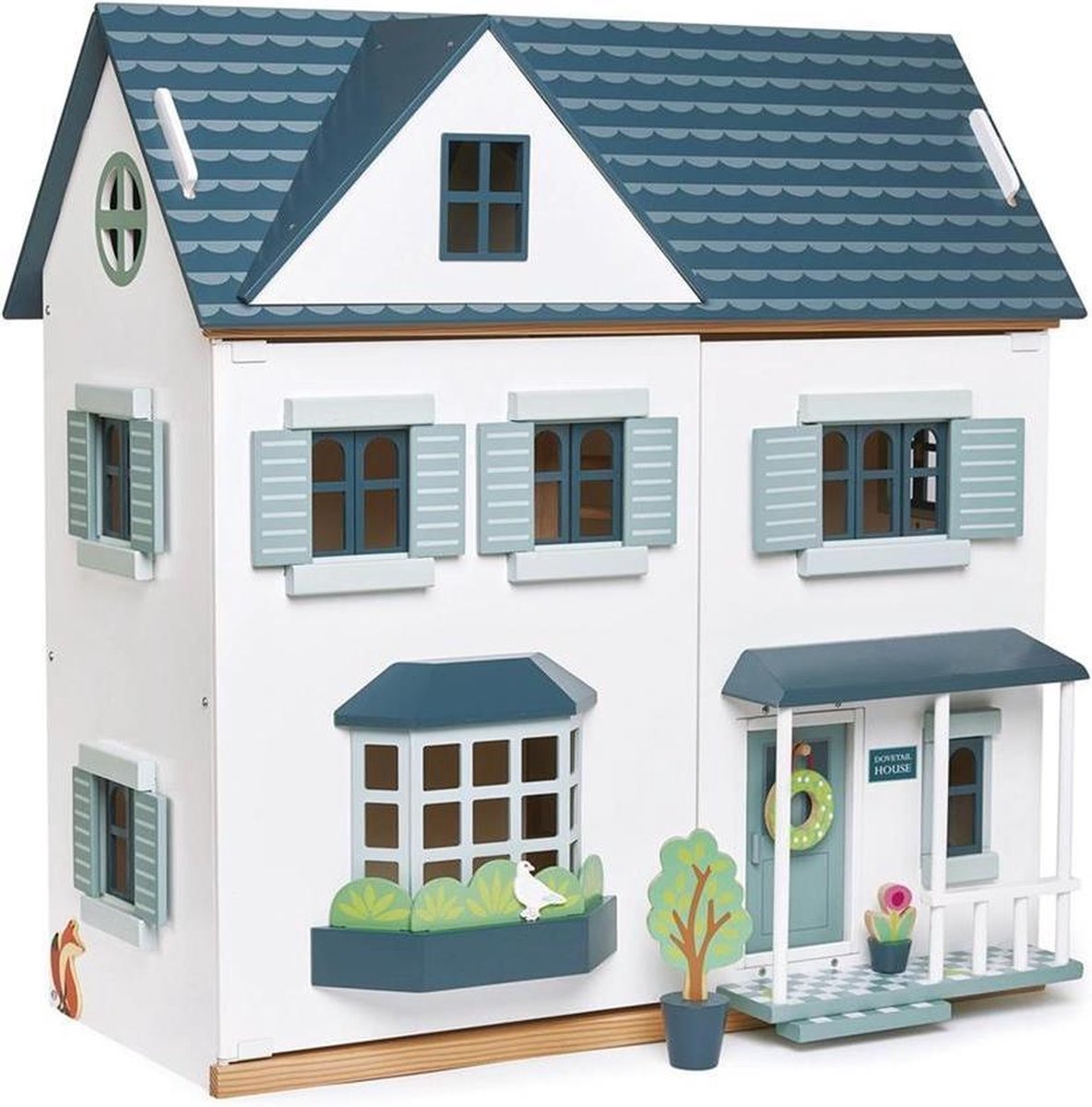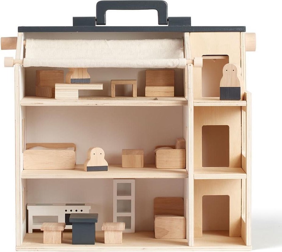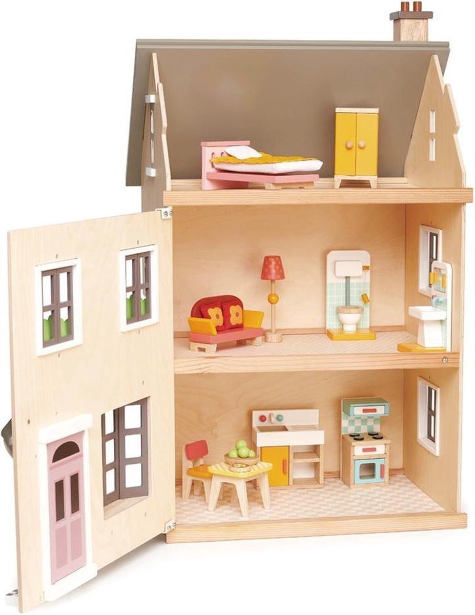 [C] Tender Leaf uniek houten poppenhuis Dovetail XL in neutrale kleuren inclusief houten poppen familie - woonkamer meubeltjes en keuken meubels- 68 x 70 cm