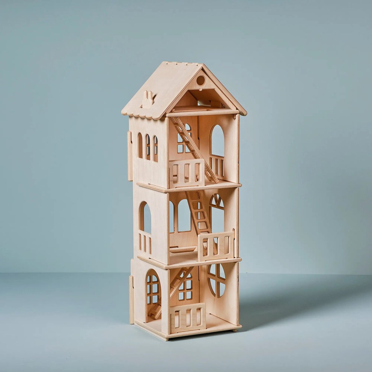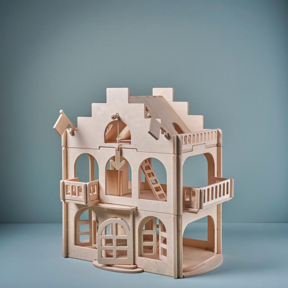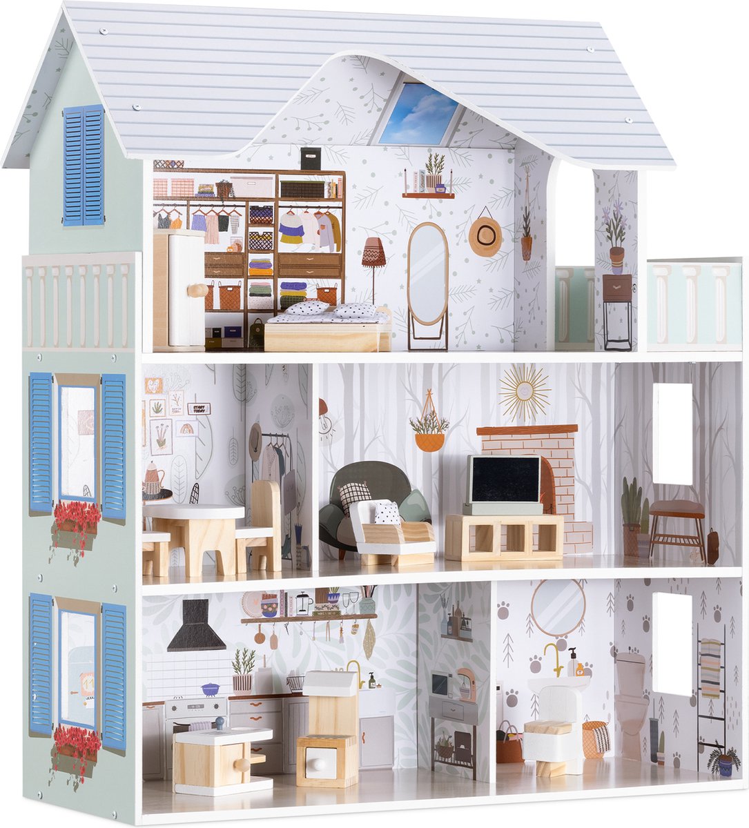 Petite Amélie Houten Wit en Pastelblauw - H.81 cm - Incl. 14-delige Meubelset - Drie verdiepingen met illustraties - Toegang via trappen en magische lift
