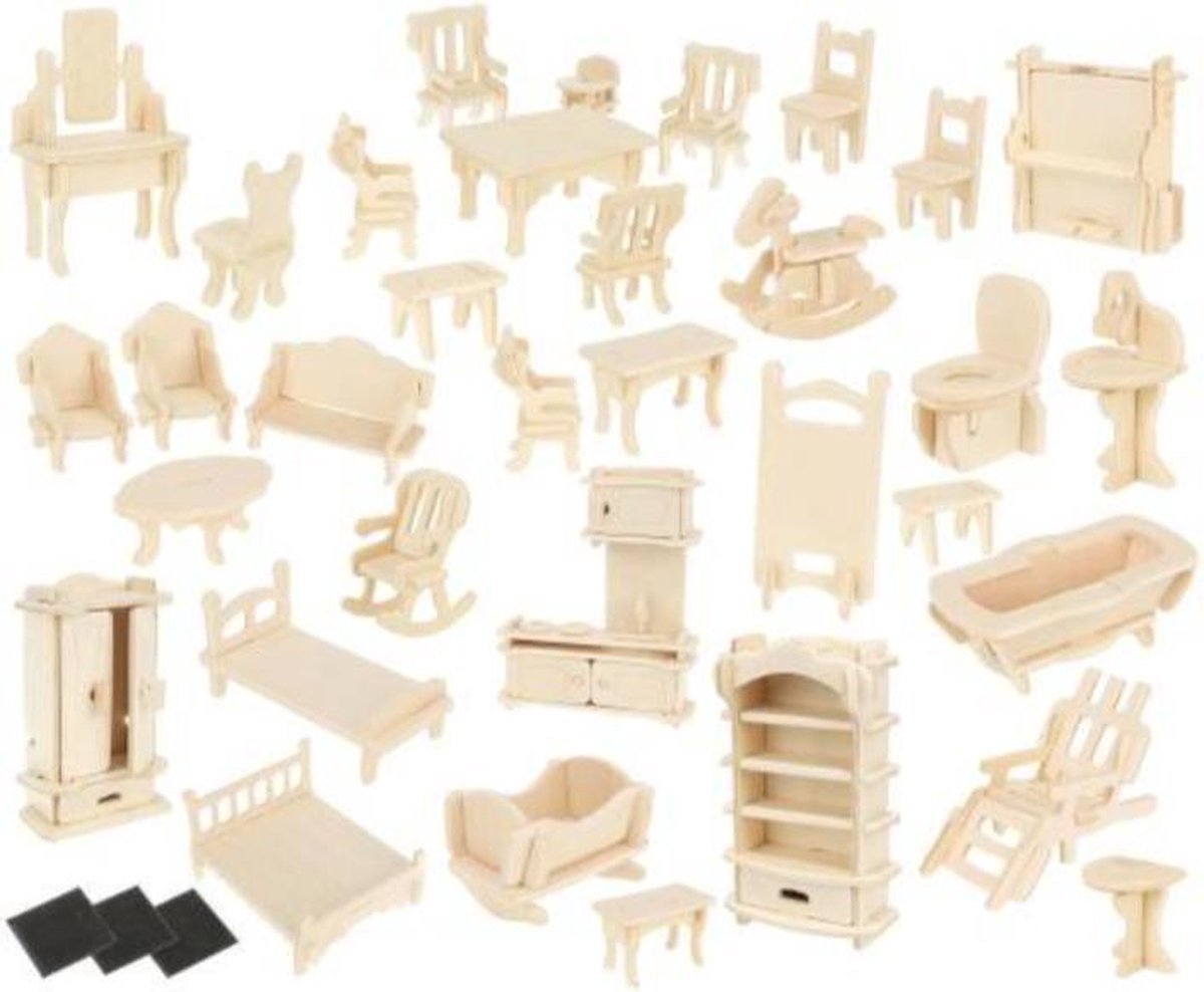 Houten Opvouwbaar incl. 30 stuks. Meubelset, 4 Poppen en Hond 7016