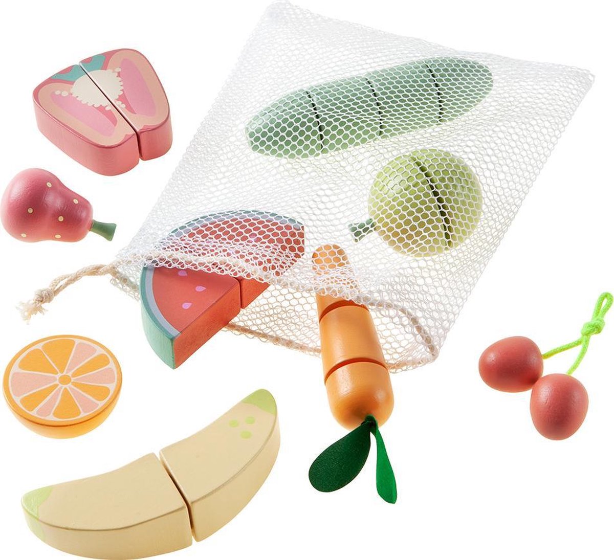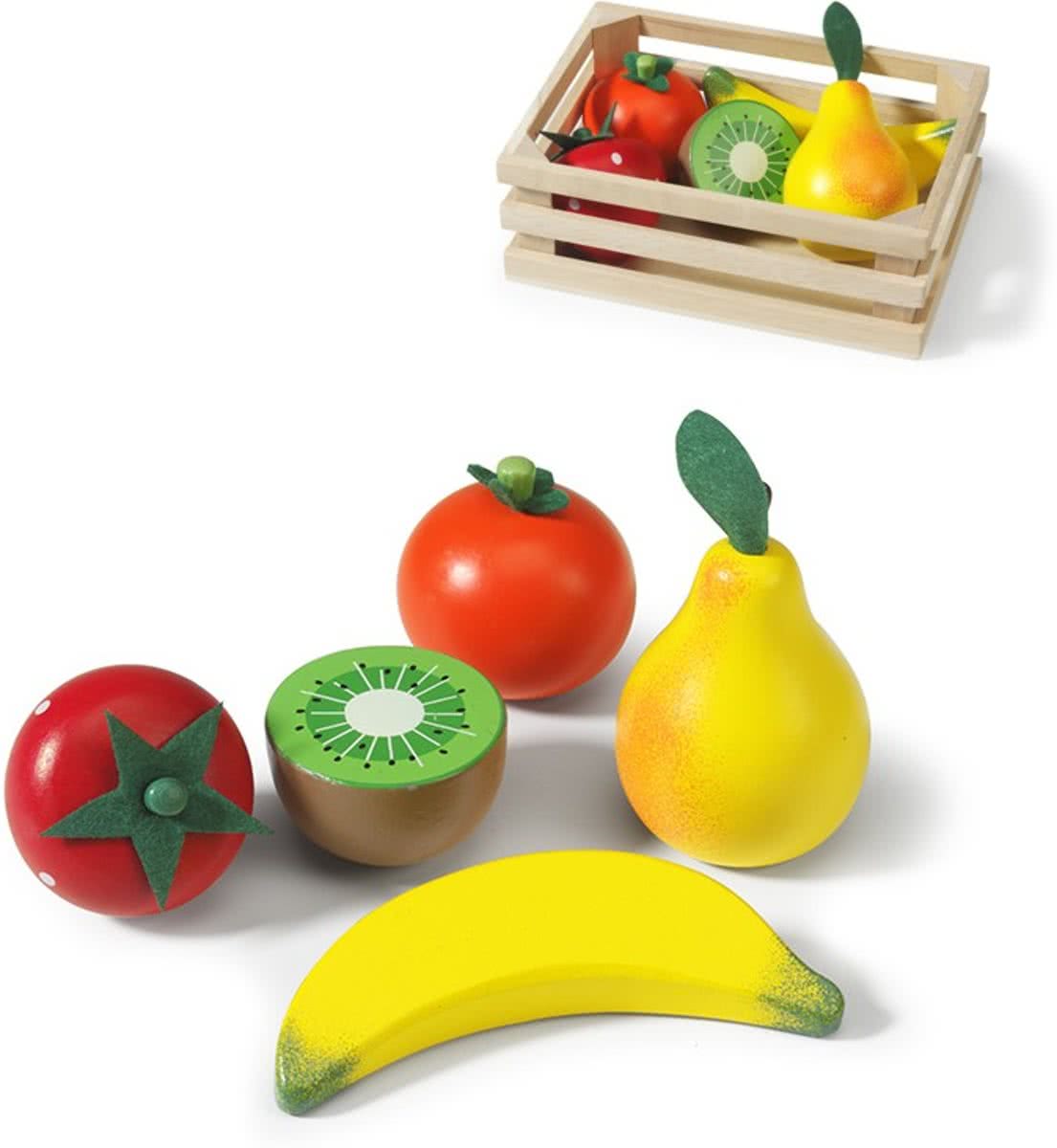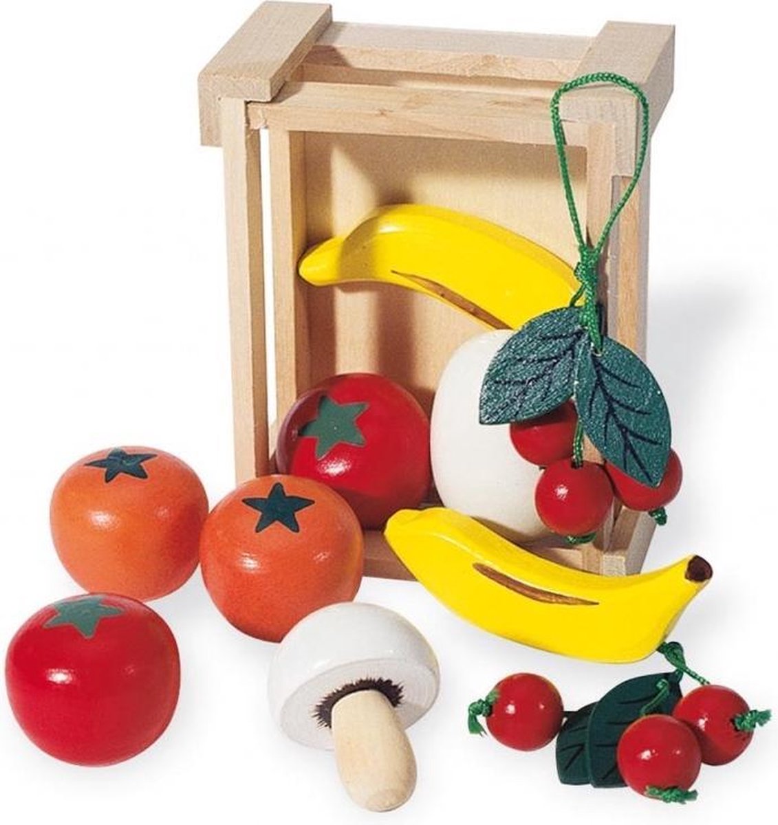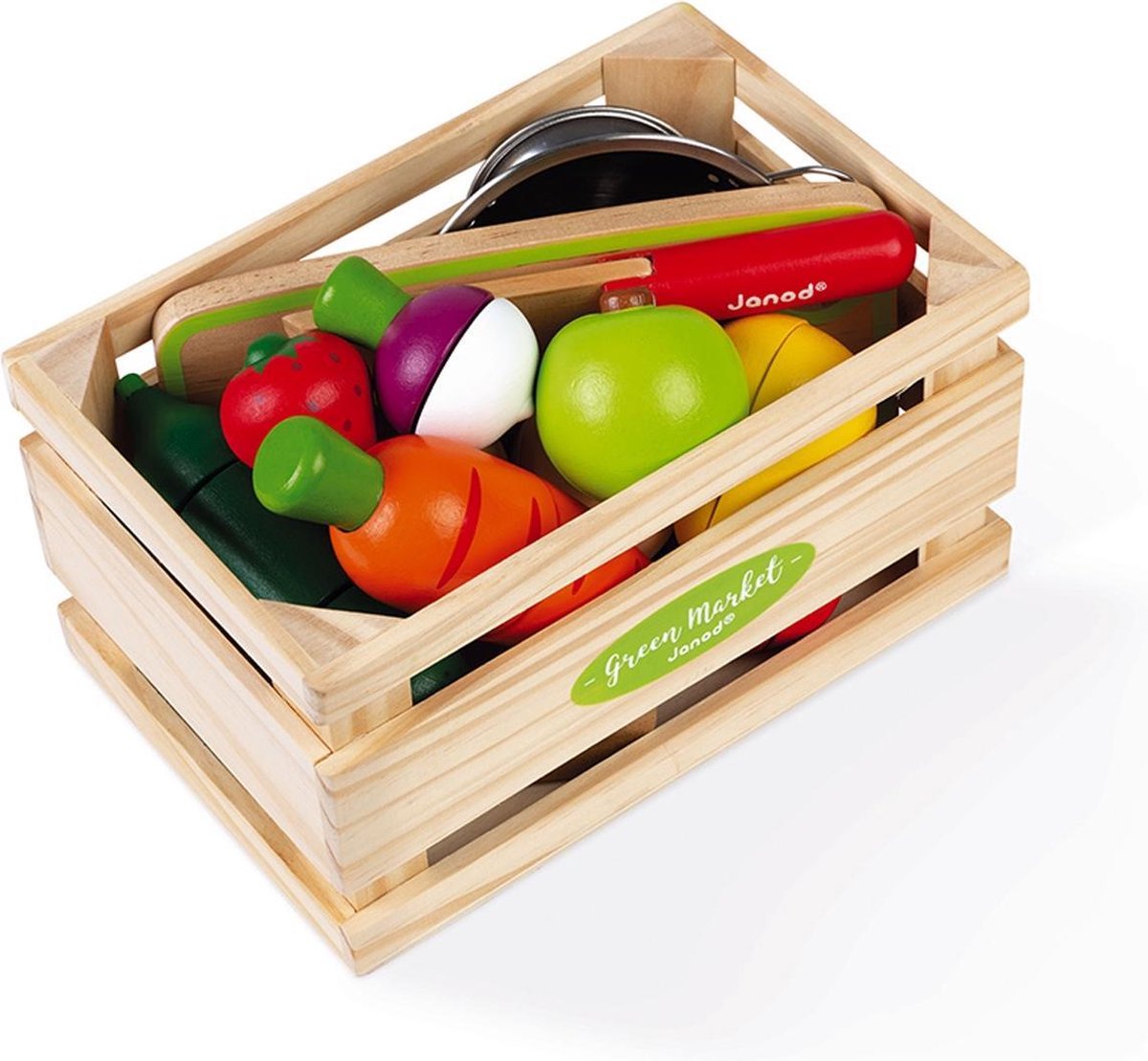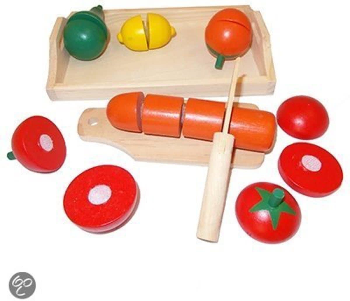 Houten Speelgoed Snijset "Fruit en Groenten" met Snijplank, Mes, Net en Doos 13-delig 4891